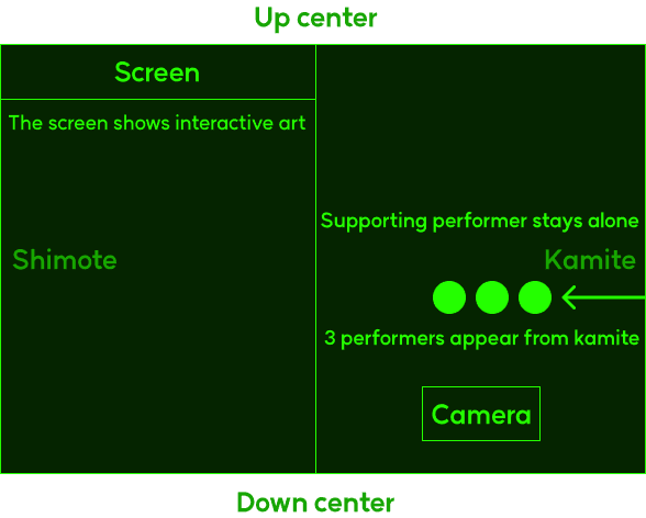 Setting performer positions on stage, how performers interact, scene shifts, background music